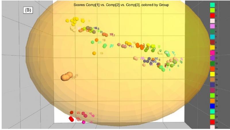 SIMCA或者SIMCA-P(其中SIMCA是新版本)可以画出来的,小圆圈应该是自己画上去的,因为软件只会有小点聚集在一起,所以应该是自己后加的。