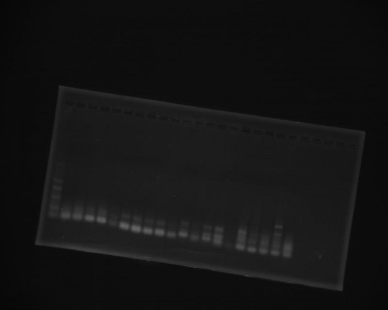 我刚做完线虫的RNA提取,结果非常不好,由于是初次接触分子方面的试验,不知道RNA提取过程中都应该注意什么问题,应该如何避免。另外想请教大家有关线虫基因内参片段大小为多少?akt-2,hsp-16.2,hsp-70,tub-1,sod-3,daf-16,skn-1的分子片段各为多少,急求帮忙啊! 另外附上我跑完的电泳结果,这是用不同引物反转录后得到的结果,不知道最前边的条带是什么啊? |