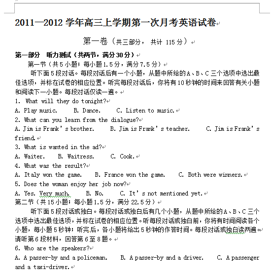 【试卷资源】2011—2012学年高三上学期第一次月考英语试卷