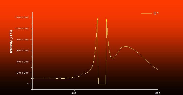 跪求高手帮我分析一下荧光发射图谱,为什么会有两个尖峰啊??? 我几天前一样的样品只有一个波峰,为什么今天测出来会是这样? 我的激发波长为467