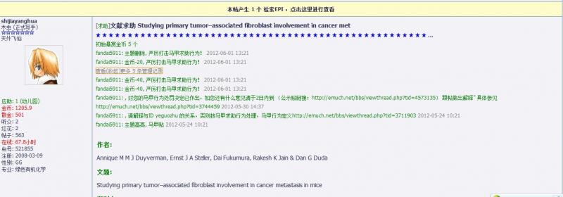 版主fandai5911 你好! 我对该贴的解释如下: shijiayanghua和yeguozhu分别属于不同人,我和yeguozhu分属于同一个研究所的不同研究室,他最近在写文章期间,有较多的文献需要查询,为了不让马甲行为发生,同时,为了避免同一个ID求助过多文献,我们没有注册马甲号,而是用多年使用的小木虫ID来申请求助文献,目的就是避免马甲行为。 希望版主在发这种帖子之前和我们沟通一下,作为小木虫长期注册的用户,我们还是对小木虫有一定感情的,因此,在不违背版规的前提下,我们也得到了小木虫的帮助,在此我们也需要进行感谢。 另,此帖不知看到的人会不会很多,希望此贴不是公开帖,并在此帖公开的范围内,希望能得到公平对待,如果处理确实有误,我们希望能得到版主fandai5911的道歉。 如果有需要,我们可以将我们进一步的个人信息公开,ID均使用我们本人的姓名拼音进行注册,并且长期使用。 |