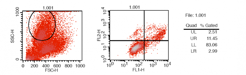 如果FACS检测没问题,补偿正确,右图显示的像是necrosis特点,可能是对照组细胞处理条件不当。