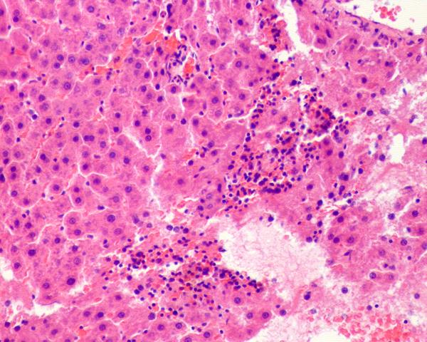楼上说的对,肝组织呈片状坏死病灶,,肝细胞浊肿、气球样变性。肝细胞中度点状、碎片状坏死,炎症细胞浸润。