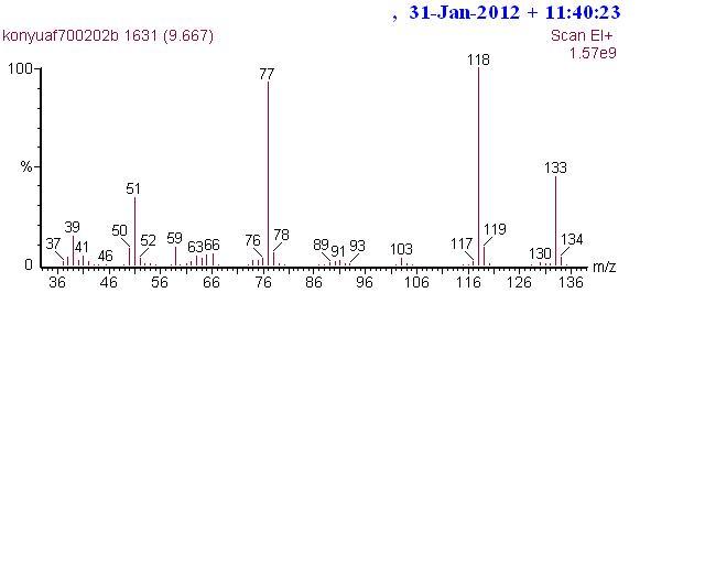 以下是做气质得到的一个关键组份的质谱图,总的不出合理的分子结构,还请,高人帮忙。该物质是通过苯胺与过氧硫酸胺反应得到的,不知图中133是否是分子离子峰,若是的话,该物质不是苯胺的二聚体,133与118相差15。可是产物中不应有甲基,再看77的峰,应该有苯环的,其他就不知怎么推了,还请好心人帮忙![]() |