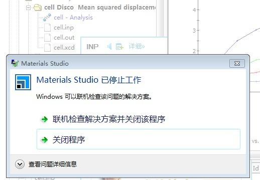 我刚刚学习MS这软件,请高手指点一下,麻烦啦。一直都是这个问题,求指教!谢谢啦 我在计算均方位移,出结果后,点击查看cell.xcd的文件就总是说MS已停止工作,要我关闭MS。如下图: 每次查看结果里面的图,表之类的,就出现这个问题 |