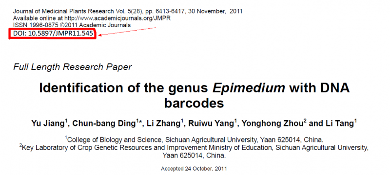 题目:Identification of the genus Epimedium with DNA barcodes 期刊名:Journal of Medicinal Plants Research 卷/页:Vol. 5(28), pp. 6413-6417, 30 November, 2011 |