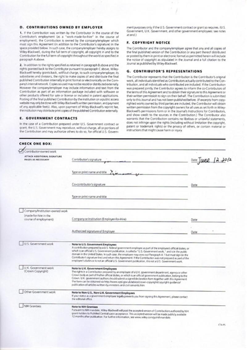 Wiley-Blackwell版权转让协议填写求助 G. CONTRIBUTOR’S REPRESENTATIONS CHECK ONE BOX: 1. Contributor-owned work 2. Company/Institution-owned work 1和2大家一般选哪个呀? |