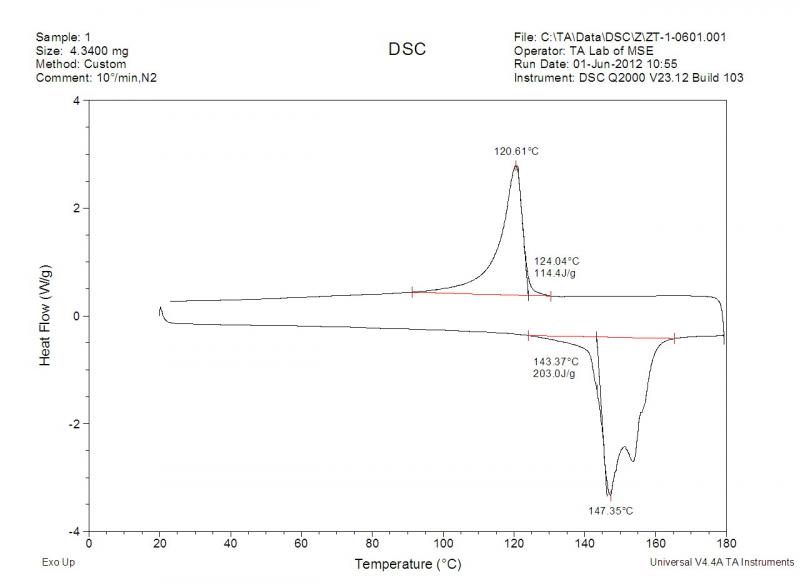 最近做了个超高分子量聚乙烯(UHMWPE)的DSC,发现降温结晶有两个(我的样品是单一组分),不知为什么?做测试的老师解释说有可能是因为该样品中含有两种晶形,每种晶形的降温结晶温度不同,所以会出现两个结晶峰,请问这种解释正确吗?请高手帮忙详细解释一下,谢谢! 超高分子量聚乙烯 DSC结果 |
