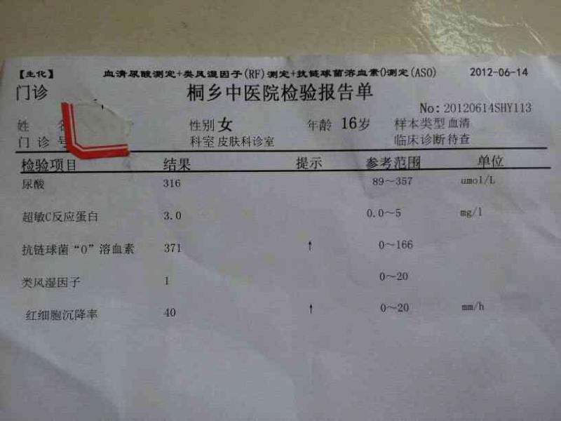 项目 结果 参考值 抗链球菌O溶血素 371 0-166 红细胞沉降率 40 0-20 但是最后标本状态显示:正常 我现在的膝盖常常很痛,不知道什么原因,就做了这个检查。请大家帮我看看是什么问题?谢谢! 检验报告单 |