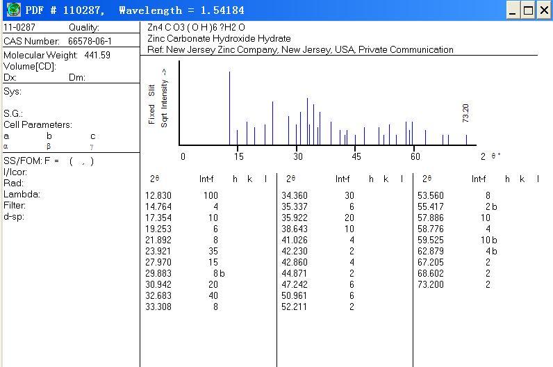 求Zn4CO3(OH)6•H2O(JCPDS 11-0287) 的卡片信息