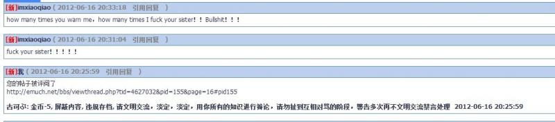 imxiaoqiao虫子在https://muchong.com/bbs/viewthread.php?tid=4627032&pid=155&page=16#pid155多次辱骂他人,版主多次警告无效,同时多个虫子反映辱骂他人并请求屏蔽内容,本人根据实际情况,对辱骂内容进行屏蔽。 该虫子不仅不反思反而该连续发信息辱骂本人,综合考虑,处罚以永久禁言处理。 辱骂截图: |
