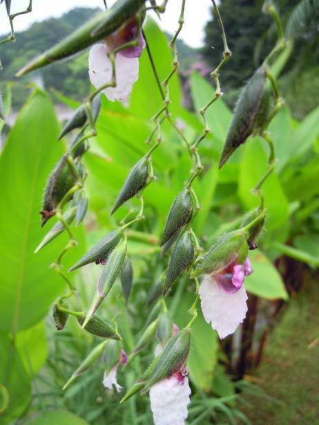 第4种 Pilea microphylla 小叶冷水花 更多图片见:http://www.nature-museum.net/album/ShowSpAlbum.aspx?spid=10483 纤细小草本,无毛,铺散或直立。茎肉质,多分枝,高3-17厘米,粗1-1.5毫米,干时常变蓝绿色,密布条形钟乳体。叶很小,同对的不等大,倒卵形至匙形,长3-7毫米,宽1.5-3毫米,先端钝,基部楔形或渐狭,边缘全缘,稍反曲,上面绿色,下面浅绿色,干时呈细蜂巢状,钟乳体条形,上面明显,长0.3-0.4毫米,横向排列,整齐,叶脉羽状,中脉稍明显,在近先端消失,侧脉数对,不明显;叶柄纤细,长1-4毫米;托叶不明显,三角形,长约0.5毫米。雌雄同株,有时同序,聚伞花序密集成近头状,具梗,稀近无梗,长1.5-6毫米。雄花具梗,在芽时长约0.7毫米;花被片4,卵形,外面近先端有短角状突起;雄蕊4;退化雌蕊不明显。雌花更小;花被片3,稍不等长,果时中问的一枚长圆形,稍增厚,与果近等长,侧生二枚卵形,先端锐尖,薄膜质,较长的一枚短约1/4;退化雄蕊不明显。瘦果卵形,长约0.4毫米,熟时变褐色,光滑。花期夏秋季,果期秋季。 |
