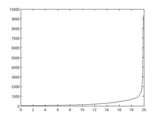 到a(7)之后就出不来了,是不是数组定义有问题呢?求教大神~~ clear all s=0; u1=0.5; u2=0.01; for h=0:0.1:20 for z=0:0.1:h-0.1 for r=0:0.1:5 l1=(h-z)/(20-z)*sqrt((20-z)^2+(r^2)); l2=(20-h)/(20-z)*sqrt((20-z)^2+(r^2)); s1=(exp(-u1*l1-u2*l2))*r/(l1*l2)^2; s=s+s1; end end a(10h+1)=s; s=0; end h=0:0.1:20; plot(h,a); |