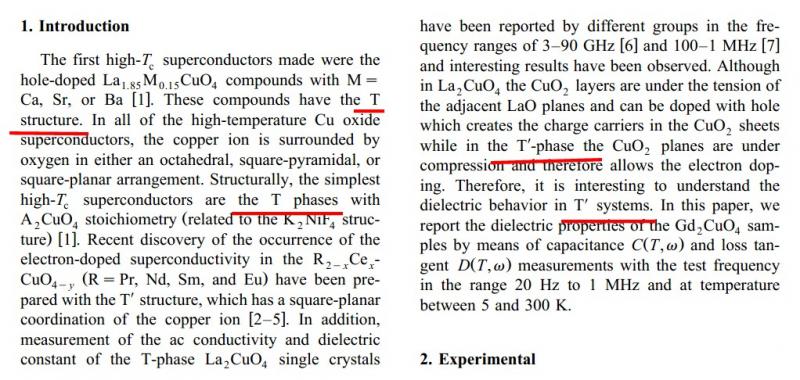 | 实际上铜氧化物高温超导体总共有三种比较类似的结构: T 相,T’相和T*相。其中T相的主要代表是La2CuO4,具有铜氧八面体结构。上下两个顶氧,中间是四个氧包围着一个铜原子。T‘相主要是Nd2CuO4为代表。没有上下两个顶氧,只有铜氧四边形。T*相是介于T与T’相之间的,(La,Nd)2CuO4这种互掺结构里面有。它具有金字塔形的铜氧五面体,只有一个顶氧。具体晶体结构可以参考:http://arxiv.org/ftp/cond-mat/papers/0209/0209277.pdf |