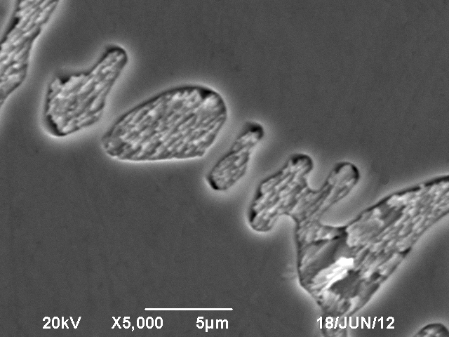 最近做了一个CuSb90的SEM,想看看共晶相,但是比较模糊楚,感觉聚焦不好,不知道是啥原因?但是我用1000倍的光学显微镜拍的话还是很清楚的。 (1)由于Sb是半金属,是不是由于导电性不好造成的呢? (2)是不是我的样品腐蚀程度不够? 求高人解答? |
