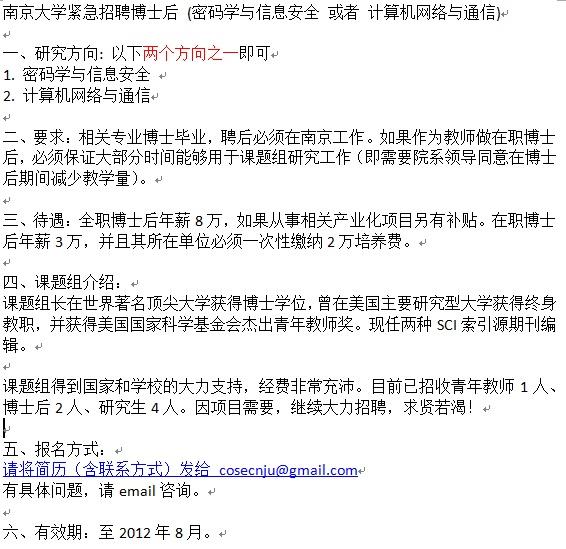 南京大学紧急招聘博士后 (密码学与信息安全 或者 计算机网络与通信)