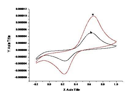 我用的是AU/Fe3O4催化分解H2O2,扫速50mv/s,a是在缓冲液中的循环伏安图,b是在H2O2中的。理论上应该是b的响应电流高于a的,这里出现了相反的现象,求高手解读!!!
