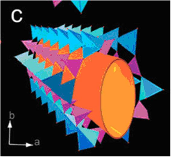 这种图,有两个前提,第一,晶体结构中确实存在着孔道;第二,孔道周围的原子配位模式(貌似图中是四配位)。如果可以,直接在diamond中做。第一,使用构建多面体功能(画出外面的四棱锥),第二,通常大家都会选择在孔道中插入几个亚原子,再连接。改变直径。这个途中的圆柱体我也不太清楚怎么画得,因为画出来的键顶端是鼓出来的不是平面,是不是在ps中修过?有知道的大侠请说一下。如果你自己的晶体自身的结构不行,大概也是画不出来的。