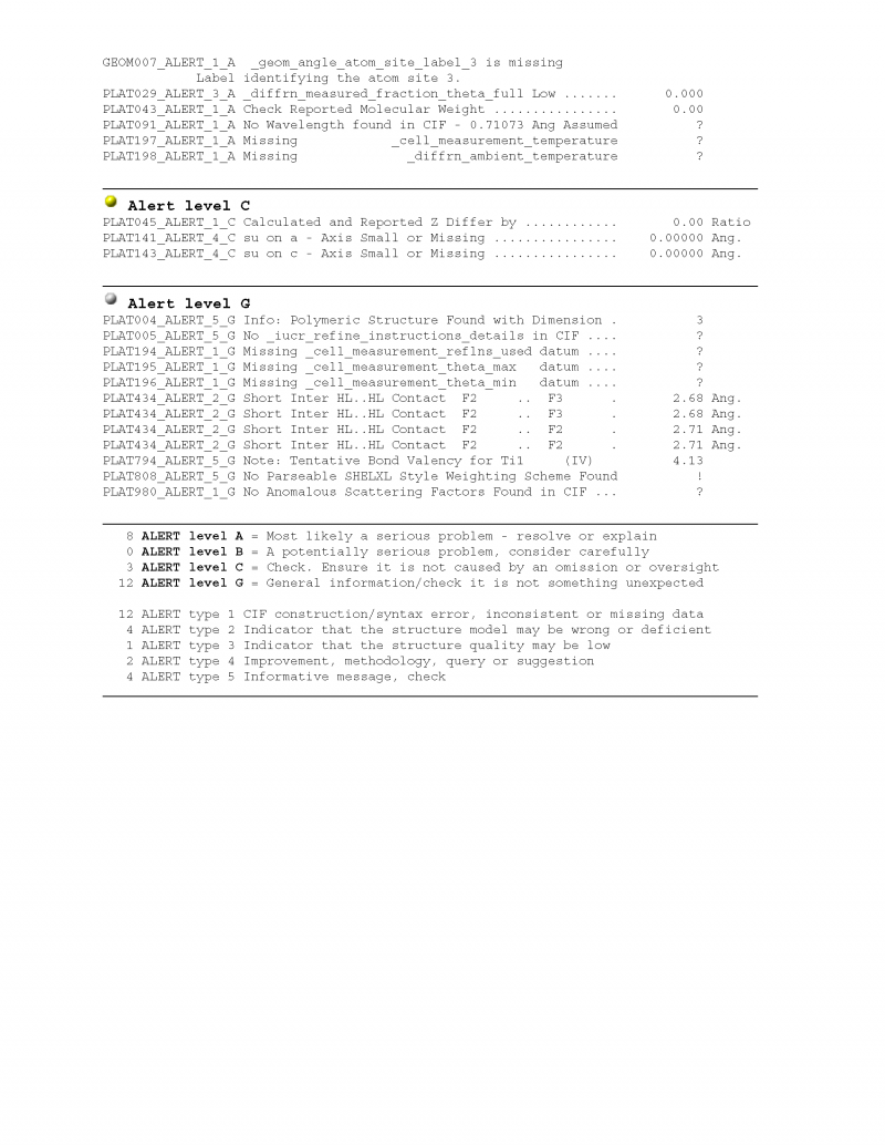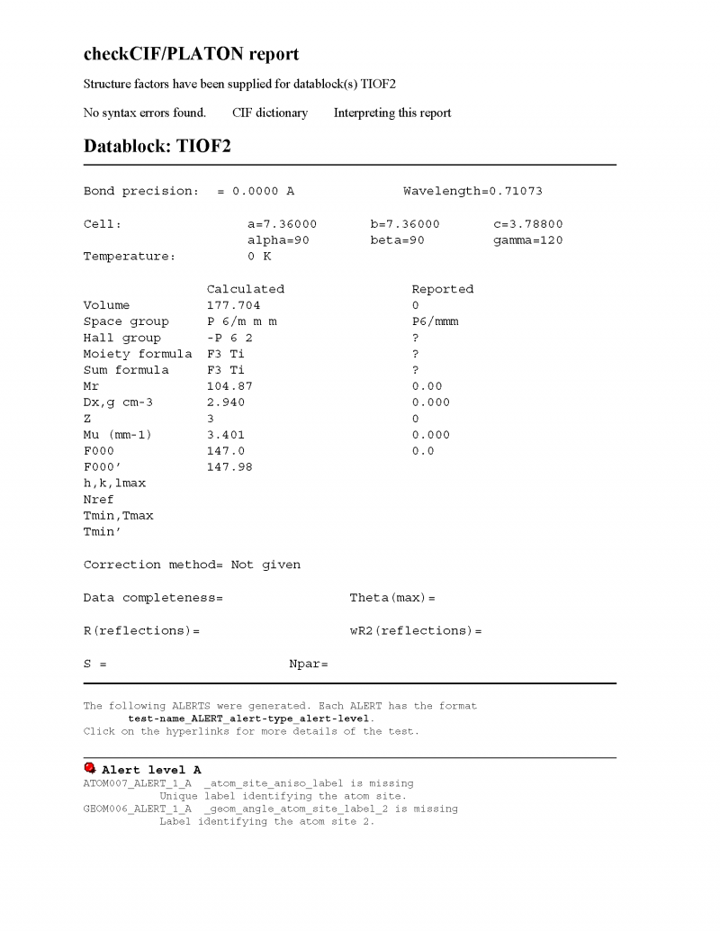 文献和卡片上都找不到这种材料,我们是从粉末衍射和选区电子衍射的结果猜出这种结构的,该结构产生的粉末衍射和实验吻合很好。材料的分子式是TiOF2,其中O和F是随机分布,我们推测的结构图如下: Space Group P6/MMM Cell parameters a=b=7.36, c=3.788 Atom x y z Occup. Ti 0.5 0.5 0.5 1 (O/F)1 0.7871 0.2129 0.5 1 (O/F)2 0.5 0.5 0 1 The element F and O randomly distributed on (O/F) sites, and the ratio of F to O is 2:1. 结构是从Materials Studio里画,然后导出cif格式文档的,在http://checkcif.iucr.org/查到一堆Warning. 因为对单晶解析不懂,对这些warning一头雾水。 想请教的是: 1. 这个cif可以用来投稿么? 2.如果不能,要怎么修改呢? [ Last edited by fuzp on 2012-6-21 at 16:51 ] |