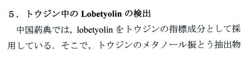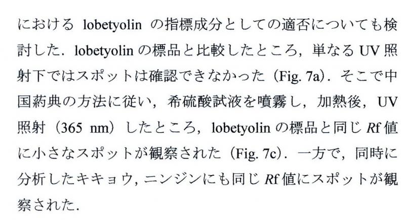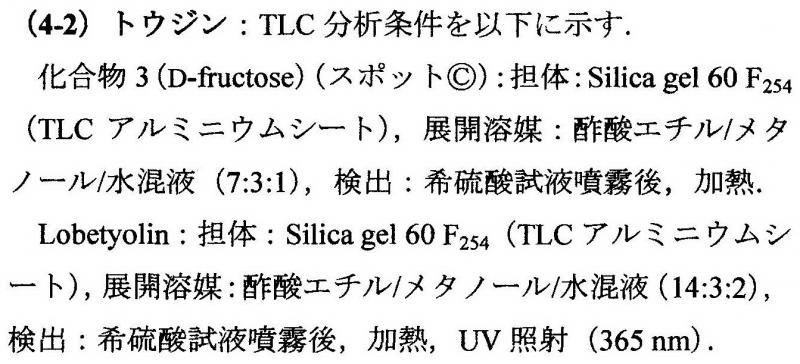 根据中国药典,TOgen中以党参炔甘的含量作为标准,其中TOgen中的甲醇萃取物所含党参炔甘量合适与否进行讨论判定。与党参炔甘的标样比较,采用单一的UV检测方法观察斑点的方法不能确认(fig7.7a)按照中国药典的方法,采用稀硫酸喷雾加热,UV(365nm)与党参炔甘的标样比较,发现有相同的Rf 但是斑点较小(fig。7c)另一方面,同时观察到橘梗,胡萝卜相同的Rf的斑点也可以观察到