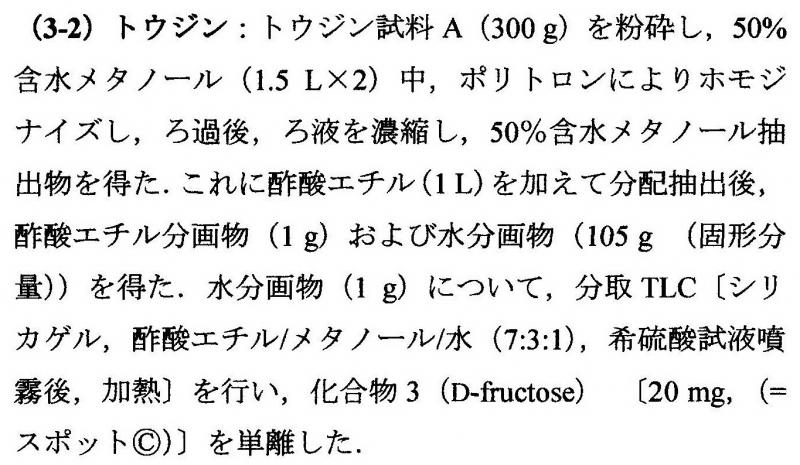 Togen 原理A300g粉碎,放入50%的甲醇水溶液中(1.5L*2),用polytron 搅匀,过滤后,过滤液浓缩,得到上面甲醇水溶液的萃取物。所得产物加入乙酸乙酯1L萃取后得到1g乙酸乙酯的分画物,以及105g水的分画物,其中1g水的分画物用过TLC板(Silical ,乙酸乙酯:甲醇:水=7:3:1,稀硫酸喷雾加热显色),得到化合物3(d- 果糖)20mg
