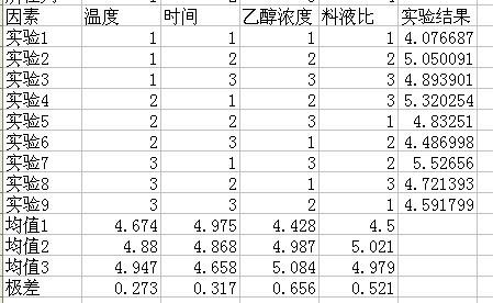 还有就是,极差的大小反应的是各个因素对结果的影响大小。如:乙醇浓度的极差值>料液比极差值>时间的极差值>温度极差值,说明乙醇浓度对试验结果的影响最大,温度的影响最小。