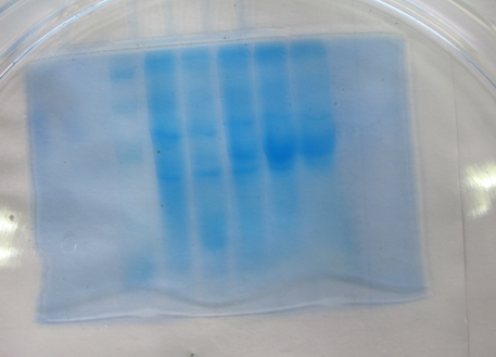 建议减少样品的上样量,缩短染色时间一般新染色液20min即可差一点的染40min,电泳缓冲液用新稀释配制的。