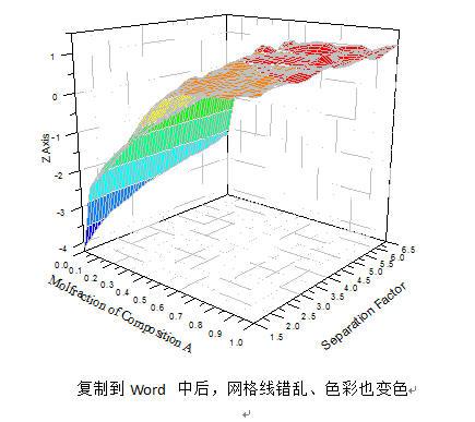 各位大侠: 本人用Origin 做三维图,做好之后,将图复制到word 文档中,XY、XY、YZ三个平面的网格线不清楚,而且有些错乱;色彩也发生了变化。如图所示: 请问是何原因,如何解决。 谢谢大家! Origin 中的3D 原图 复制到Word后 |