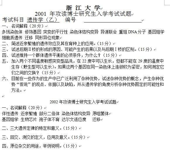 【真题资源】浙江大学遗传育种学博士考题2001-2009(缺05,06) (很难找)