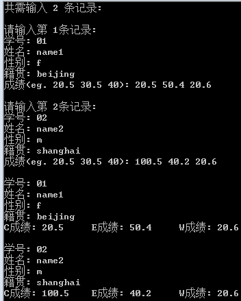 struct guanli{char xuehao[20];char xingming[20];char sex[20];char jiguan[20];float c,e,w,zong,pingjun;