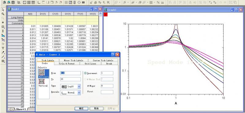 使用对数坐标log10, 自定义函数:sqrt((1+Col(A)/1)^2/((1-Col(A)^2)^2+(Col(A)/1)^2)),式中Col(A)/1表示Qm=1