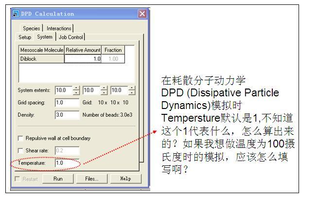 在耗散分子动力学DPD (Dissipative Particle Dynamics)模拟时,Tempersture默认设置是1,不知道这个1代表什么,怎么算出来的?如果我想做温度为100摄氏度时的模拟,应该怎么填写啊?![]() [ Last edited by slogger on 2012-6-28 at 17:23 ] |