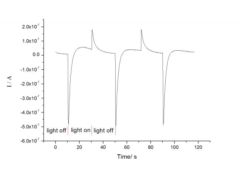 请帮助分析为什么光电流测试这样的?样品室TiO2粉末涂覆层在FTO上。TiO2是锐钛矿相的。谢谢~~