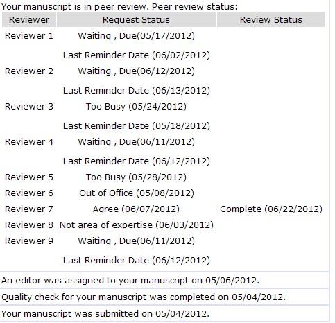 5月4日投稿到美国OSA 旗下 杂志JOSA A,至今已将近两个月。刚开始找了四个审稿人,但是一个月过去,没人给审,后来编辑又加了5个审稿人,终于有一个人同意审稿,22号审稿结束,但是至今编辑未给审稿意见,有知情的虫友给指点指点怎么回事。以前投过OPTICS EXPRESS 和 APPLIED OPTICS 都是审稿人审完,编辑很快就给结论的,这次已经拖了一个星期了,不知吉凶,恳请诸位虫友赐教。