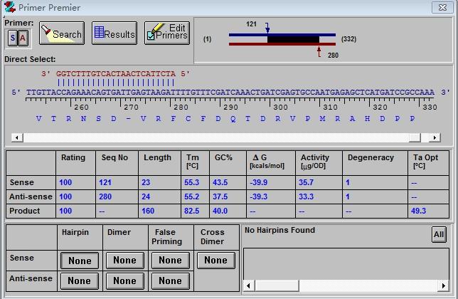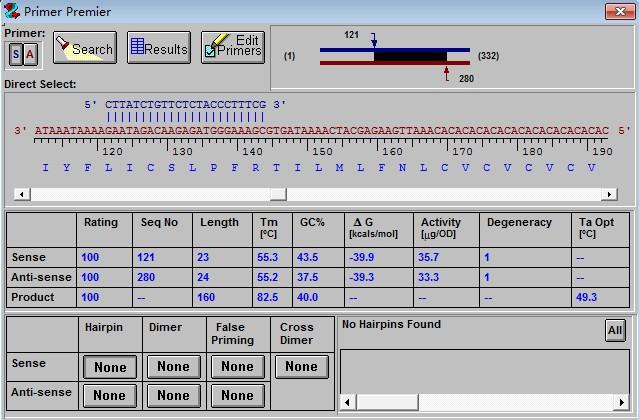用primer5设计出的一对引物如下图,送去引物公司合成后pcr扩增结果失败没有条带产生,只有二聚体,请问这是什么原因?是引物设计的问题还是其他什么问题,序列来自GENEBANK!! 这是反向引物 正向引物 |