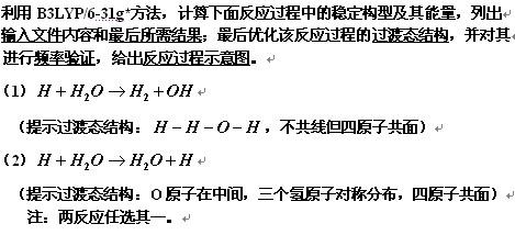 选择反应(2) 输入内容:#T B3LYP/6-31G* OPT=QST2 TEST H+H2O------->H2O+H REACTANT O H R0 H RO A0 H R1 A1 所需结果 O H R2 H R2 A2 H R3 A3 优化过渡态并进行频率分析 #T B3LYP/6-31G* OPT=(CALCFC QST2)FREQ TEST H2OH TRANS O H R2 H R2 A2 H R3 A3 反应过程示意图 --过渡态的分子结构- ---生成物结构--- --反应物的分子结构-- |