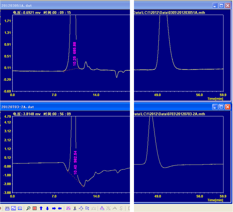 使用Shodex的SC1011糖柱分析样品时在大峰后总有拖尾的小的倒峰出现,原因?
