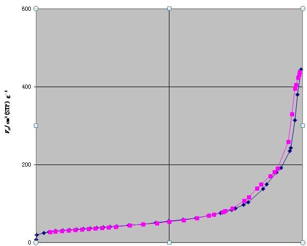 第一个图和第二个图的却别大致如下: 1.图1在P/P0=0.7左右出现小的滞后,而图2没有,意味着样品1中存在着较大的介孔; 2.很明显你样品2的脱附时设置的压力点比样品1要少; 3.两种样品的孔都比较少,应该都存在着楔壮的狭缝,即一端窄一端宽的狭缝孔; 4.样品2中的微孔数要比样品1的多,其实两个曲线最后脱附时都重合的挺好的,只不过样品2脱附时完全重合所需的压力更低,所以2中存在的大量的微孔,少量介孔;而样品1中是大量介孔,少量微孔! |