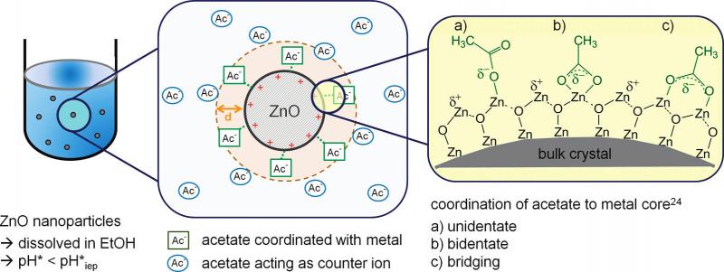 合成ZnO QDs通常用LiOH、NaOH、KOH这些强碱,相同条件下合成的量子点通过紫外-可见吸收光谱换算得到的粒径大小变化是LiOH<NaOH<KOH,请问有没有相关文献有讨论过,或者仅仅只是金属阳离子吸附在量子点表面,因为离子半径不同而致使合成的量子点粒径不同?下图给了一张我看到文献上看的ZnO量子点双电层模型,这些金属离子是存在于ZnO表面、stern层还是扩散层? |