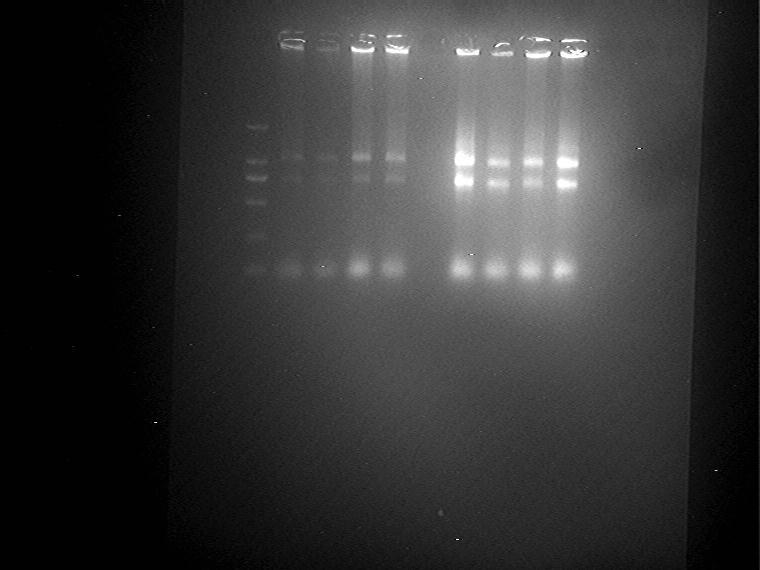 上样量是5ul的RNA和1ul的6Xloding Buffer 前面是DNA Marker2000,颜色淡的浓度是不是很低啊