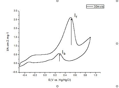 一般文献上是比较前扫峰的峰电流密度大小,大的活性就好,还可以比较onset potential ,约小约好,前扫峰和后扫峰比值做指标是很有争议的,但是现在用的人很多。还有些人认为应该比较前扫时0.4V或者小于0.4v相对于甘 ...