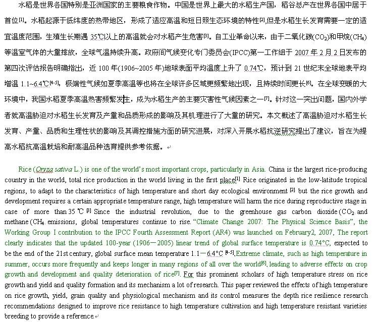 Rice is one of the dominant crops in the world, particularly in Asia. China is the largest rice-producing country in the world, whose total rice output ranks first. Rice originates from the low-latitude tropical regions and is characteristic of adapting high temperature and low sunshine environment. the rice growth, however, requires a appropriate temperature range. High temperature will harm rice during reproductive stage in case of more than 35°C. Due to constant emission of the green house gas such as carbon dioxide(CO2) and methane(CH4) since Industrial Revolution, global temperatures is continuing to rise. The fourth assessment report released by the working group of IPCC on February 2 stated clearly that average temperature of the Earth’s surface in the latest 100 year raise up 0.74°C and was expected to increase 1.2-6.4°C,and extreme climate ,such as high temperature in summer ,would occur more frequently and keep longer in many regions of all over the world. In the background of globe warming, high temperature damage for rice happens frequently in china, which is one of the main disastrous climate for rice growth. In response to the outstanding trouble, worldwide researchers carried out a lot of studies on the impact of high temperature on growth ,development ,output and quality of rice and its mechanism. For references of research of improving resistance of rice to high temperature cultivation and high temperature resistance varieties breeding ,this paper review progresses in the field of the impact of high temperature on growth ,development ,output ,quality and features of rice and its control, and present suggestions for Anti-adversity research of rice.