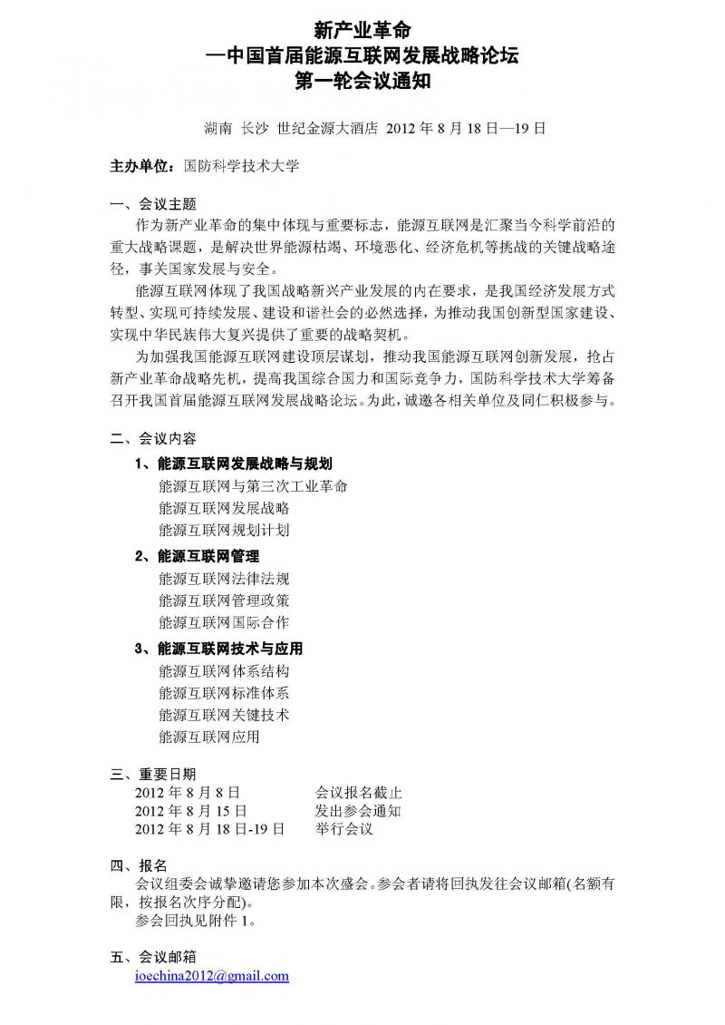 新产业geming --中国首届能源互联网发展战略论坛 第一轮会议通知 湖南 长沙 世纪金源大酒店 2012年8月18日—19日 主办单位:国防科学技术大学 一、会议主题 作为新产业geming的集中体现与重要标志,能源互联网是汇聚当今科学前沿的重大战略课题,是解决世界能源枯竭、环境恶化、经济危机等挑战的关键战略途径,事关国家发展与安全。 能源互联网体现了我国战略新兴产业发展的内在要求,是我国经济发展方式转型、实现可持续发展、建设和谐社会的必然选择,为推动我国创新型国家建设、实现中华民族伟大复兴提供了重要的战略契机。 为加强我国能源互联网建设顶层谋划,推动我国能源互联网创新发展,抢占新产业geming战略先机,提高我国综合国力和国际竞争力,国防科学技术大学筹备召开我国首届能源互联网发展战略论坛。为此,诚邀各相关单位及同仁积极参与。 二、会议内容 1、能源互联网发展战略与规划 能源互联网与第三次工业geming 能源互联网发展战略 能源互联网规划计划 2、能源互联网管理 能源互联网法律法规 能源互联网管理政策 能源互联网国际合作 3、能源互联网技术与应用 能源互联网体系结构 能源互联网标准体系 能源互联网关键技术 能源互联网应用 三、重要日期 2012年8月8日 会议报名截止 2012年8月15日 发出参会通知 2012年8月18日-19日 举行会议 四、报名 会议组委会诚挚邀请您参加本次盛会。参会者请将回执发往会议邮箱(名额有限,按报名次序分配)。 参会回执见附件1。 五、会议邮箱 ioechina2012@gmail.com [ Last edited by lipei3601 on 2012-7-16 at 00:40 ] |