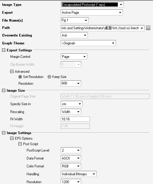 有哪位投过这个期刊呀,如题,international journal of food science and technology投稿时曲线图只能是eps格式么。如果用origin 具体怎么设置?求大侠相助!!如图设置是否正确?要求600dpi以上的。 [ Last edited by wslxdexter on 2012-7-20 at 15:02 ] |