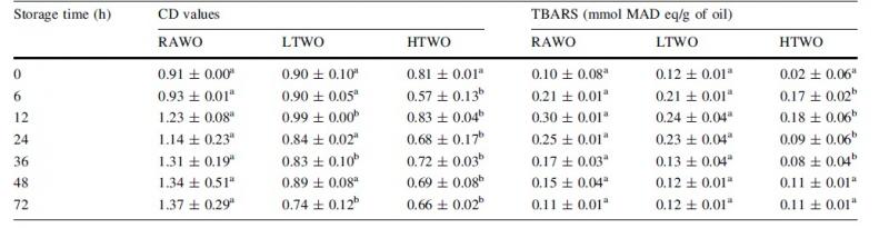 是标注,在下面的footnote中是有标注,如下: Data are expressed as means ± SD (n = 3). Means ± SD followed by the same letters, on raw are not significantly different (p[0.05) RAWO raw whole cashew nut oil, LTWO low temperature roasted whole cashew nut oil, HTWO high temperature roasted whole cashew nut oil, CD conjugated diene, TBARS thiobarbituric acid reactive substances, MAD eq malondialdehyde equivalents |