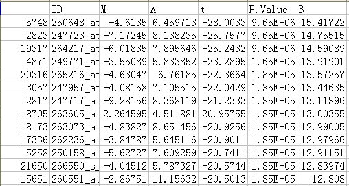 12472    910_at  3.86    9.66  29.2 8.27e-10  1.04e-05 11.61