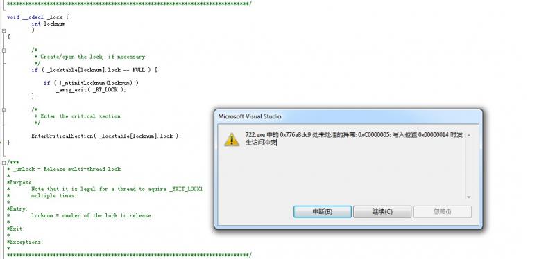 0x776a8dc9 处未处理的异常: 0xC0000005: 写入位置 0x00000014 时发生访问冲突