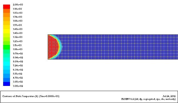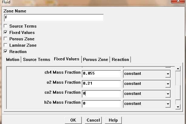 各位大侠好,我在做二维封闭管道中甲烷-空气燃烧的模拟。 管道中充满了混和好的百分之九五的甲烷。请问我该怎么设置了. 我以下这种设置对么?(如图) 边界条件——f(网格中的face)-------set ----fixed value 里面设置 ch4:0.055 ,o2:0.21 PS: 我用gambit 划分网格时, 四条边设为wall,face设为fluid 初始设置 |