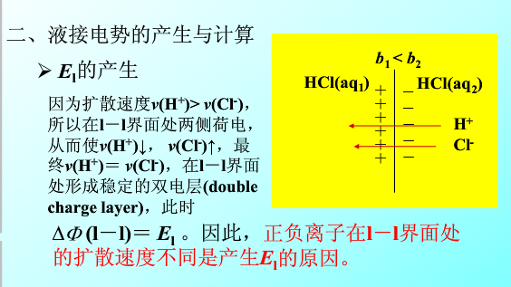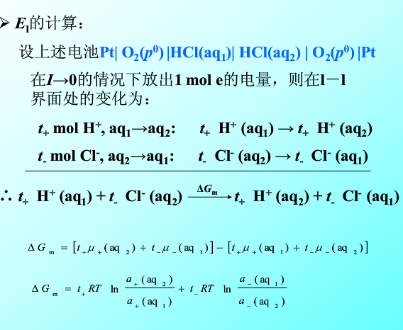 最近看到液接电势,对其形成机理清楚,就是离子的扩散速度不同导致形成双电层,但是看到书上对液接电势的推导过程有几个问题不懂。 (1) ![]() ![]() 应该是氢离子和氯离子都是从高浓度向低浓度迁移,为什么在推导电势公式中,氯离子和氢离子的迁移方向变成相反的呢? (2)如果是单液电池的话还存在液接电势吗?当液接电势稳定后,如果不是1:1型的电解质,那他们是迁移数相等还是迁移速率相等啊 |