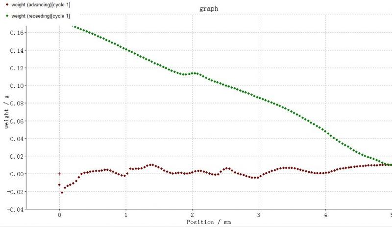 我使用 吊法()测试材料的接触角 这里: 有两个角度:advancing angle 和 receding angle 具体见附件。 角度怎么选择? 是选择某一position处的角度,还是0-5 mm这个连续位置上的所有的接触角? 谢谢。 另外,软件计算 receding angle基本为0,请问这说明什么意思? figure |